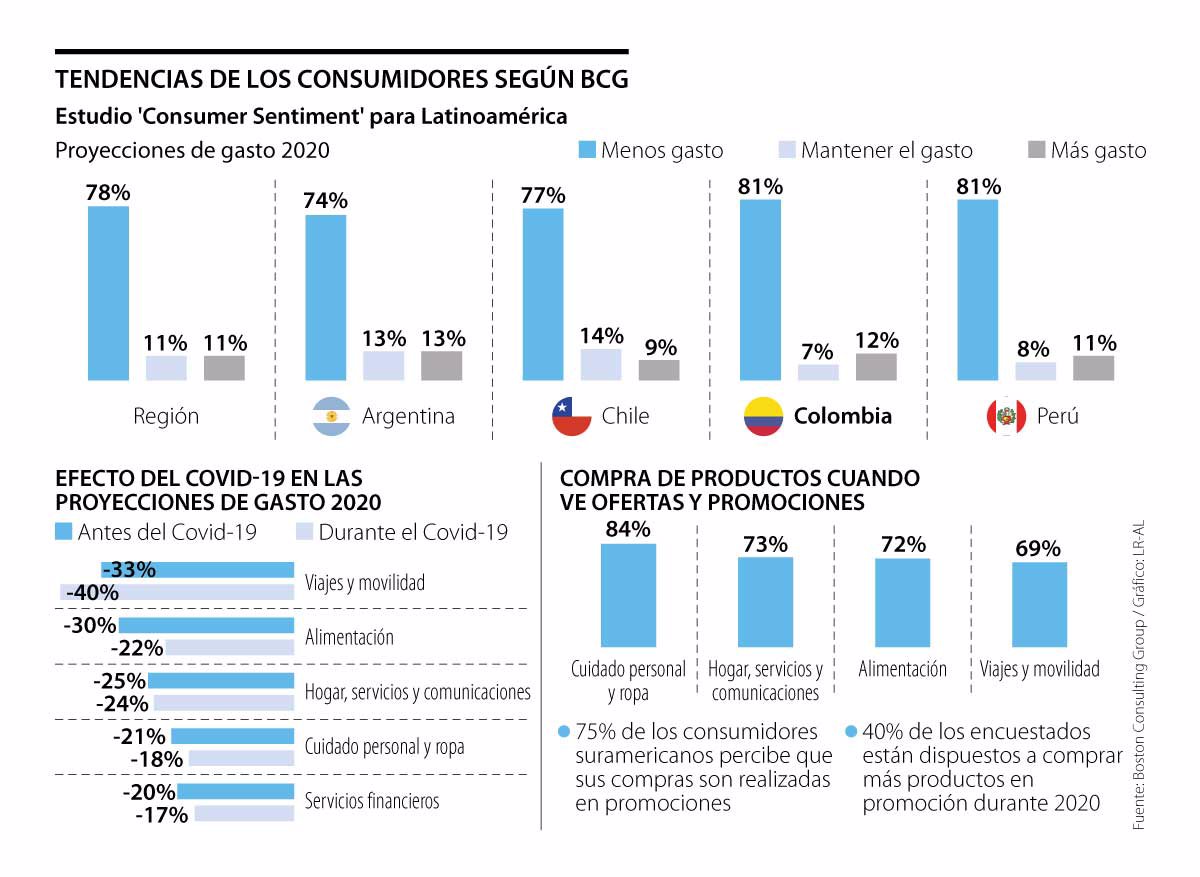 El comercio ha sido uno de los sectores que más ha sentido el impacto del Covid-19 y de las medidas de los gobiernos para intentar contener la pandemia, una situación que se refleja directamente en los hábitos de consumo de las personas. Según el estudio ‘Consumer Sentiment’, realizado para cuatro países de Sudamérica por Boston Consulting Group (BCG), para este año 81% de los consumidores espera reducir su gasto, solo 7% lo mantendría y 12% prevé aumentar sus compras.