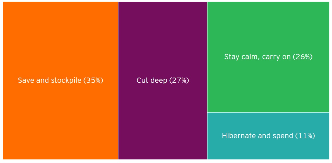 La crisis COVID-19 se está definiendo en cuatro segmentos distintos de comportamiento del consumidor, según la primera edición del EY Future Consumer Index, una encuesta a 4.859 personas que realiza un seguimiento del sentimiento y el comportamiento del consumidor en los EE. UU., Canadá, el Reino Unido, Francia y Alemania. Estos son “Cortar profundo”, “Mantener la calma, continuar”, “Guardar y almacenar” e “Hibernar y gastar”.