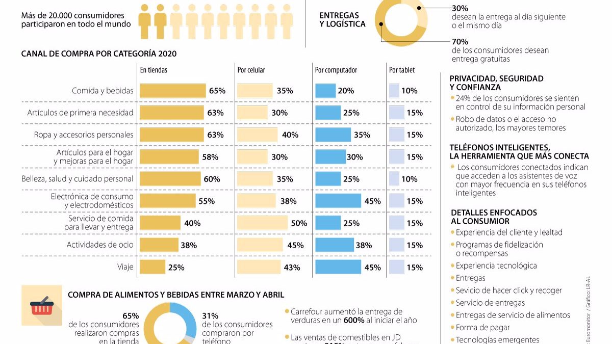Cuando se entró a analizar las compras por categorías, en las que se destacan: alimentos y bebidas; básicos del hogar; ropa y accesorios personales, y belleza y cuidado personal; se observó que los consumidores al rededor del mundo, en un porcentaje que varia entre 60% y 65%, prefirieron realizar ese tipo de compras en tiendas físicas.