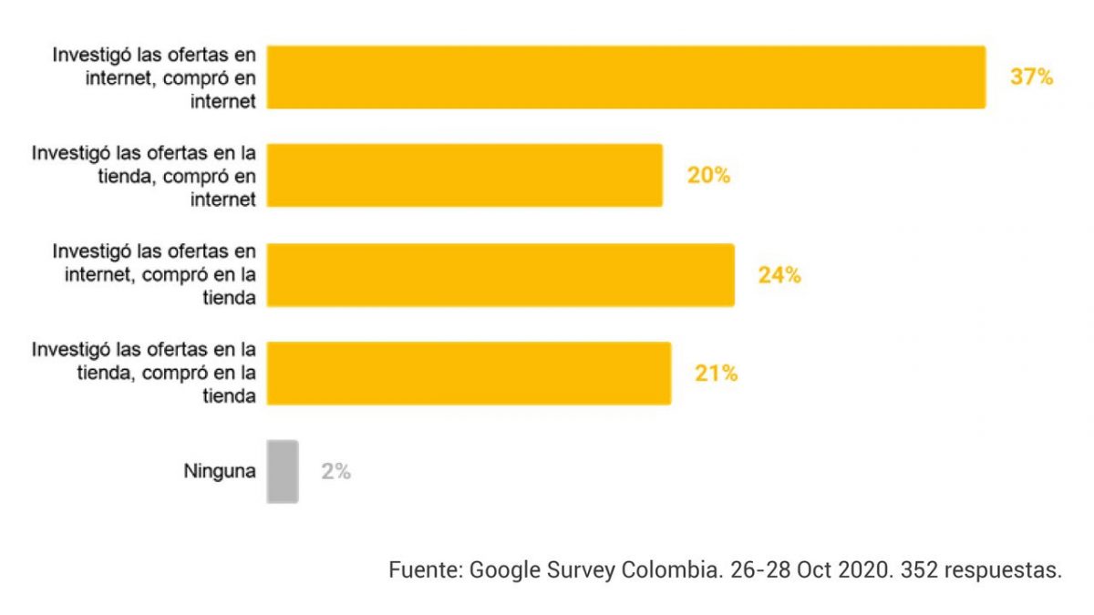 Es importante destacar que 79% de los colombianos encuestados declaran que internet estará presente, de alguna forma, dentro de su proceso de compra; ya sea investigando las ofertas online, comprando directamente en la web o ambas cosas.
