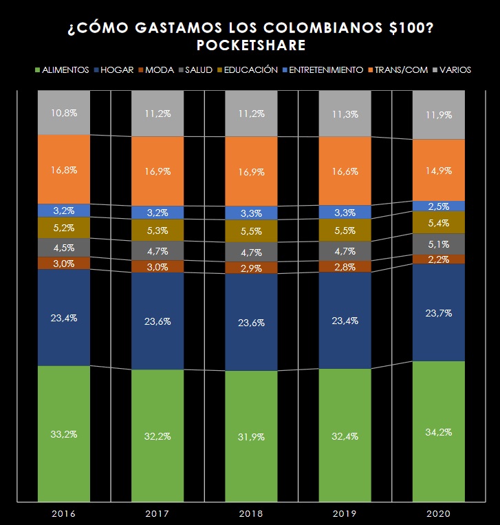 De los $ 20,3 billones destinados a la pasada Navidad, $ 6,7 billones (33,1 %) fueron gastados en alimentos ; en ese mismo mes de 2019, se destinó a estos productos 7,6 billones (31,6 %). Por el contrario, las categorías en los que menos se gastó los últimos días de 2020 fueron moda (2 %) y entretenimiento (1,5 %).