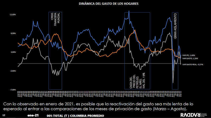 El gasto de los hogares colombianos, en enero de 2021, fue de $65,1 billones, arrojando un crecimiento de 1,33 % frente al mismo mes de 2020, que en términos reales fue de -0,7 %, según el más reciente informe de Raddar.