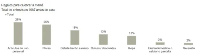 Entre los regalos más comunes, según el reporte, están los artículos de cuidado personal como maquillaje, cremas, lociones o perfumes, en segundo lugar, salen a relucir los arreglos florales, seguido de algún detalle hecho a mano por los hijos, los dulces, golosinas o algún chocolate, luego obsequios como ropa, electrodomésticos o artículos tecnológicos.