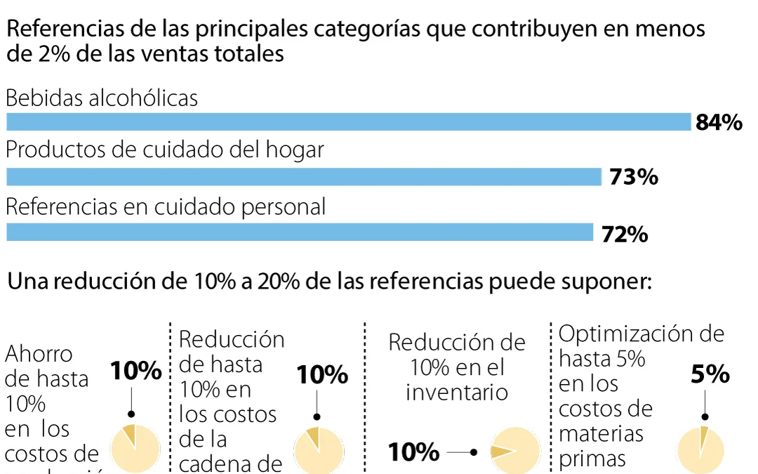 Estudios de Bain & Company demuestran que una reducción de 10% a 20% de las referencias puede suponer un ahorro de hasta 10% en costos de producción.
