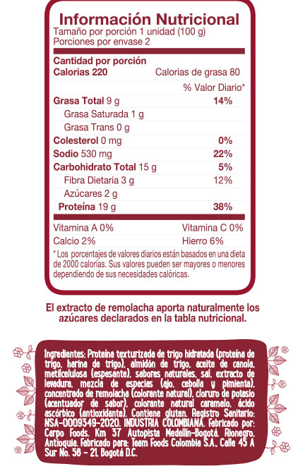 CARPO FOODS S.A.S en Medellín para TEAM FOODS COLOMBIA, y permite la comercialización de producto entre 50 y 200 g, en presentaciones: 2 unidades, 2 unidades x 6, 2 unidades x 8, 2 unidades x 10, 2 unidades x 12, 2 unidades x 20. La notificación registra como marcas asociadas JAPPI BURGER, JAPPI VEGGIE BURGER, JAPPI BURGER VEGGIE.