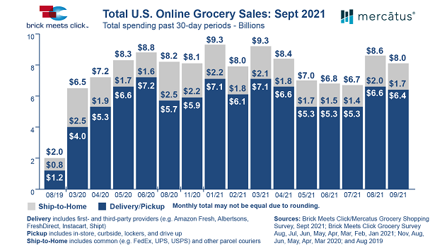 Las ventas de comestibles en línea se han cuadriplicado desde los niveles prepandémicos medidos en agosto de 2019, y los consumidores están indicando una fuerte preferencia por los servicios de recogida / entrega (Instacart, Amazon Fresh y similares) sobre el envío a casa (productos comestibles, generalmente secos mercancías – enviadas a través de mensajería de paquetes como FedEx, UPS, USPS), de acuerdo con los datos más recientes de Brick Meets Click / Mercatus Grocery Shopping Survey.