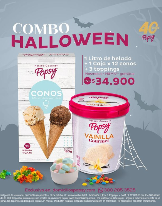Helados Popsy está promocionando en redes sociales el combo Halloween para consumo en casa disponible para compra solo entre el 30 de octubre y 1 de noviembre para compra vía portal web de compras de la cadena.