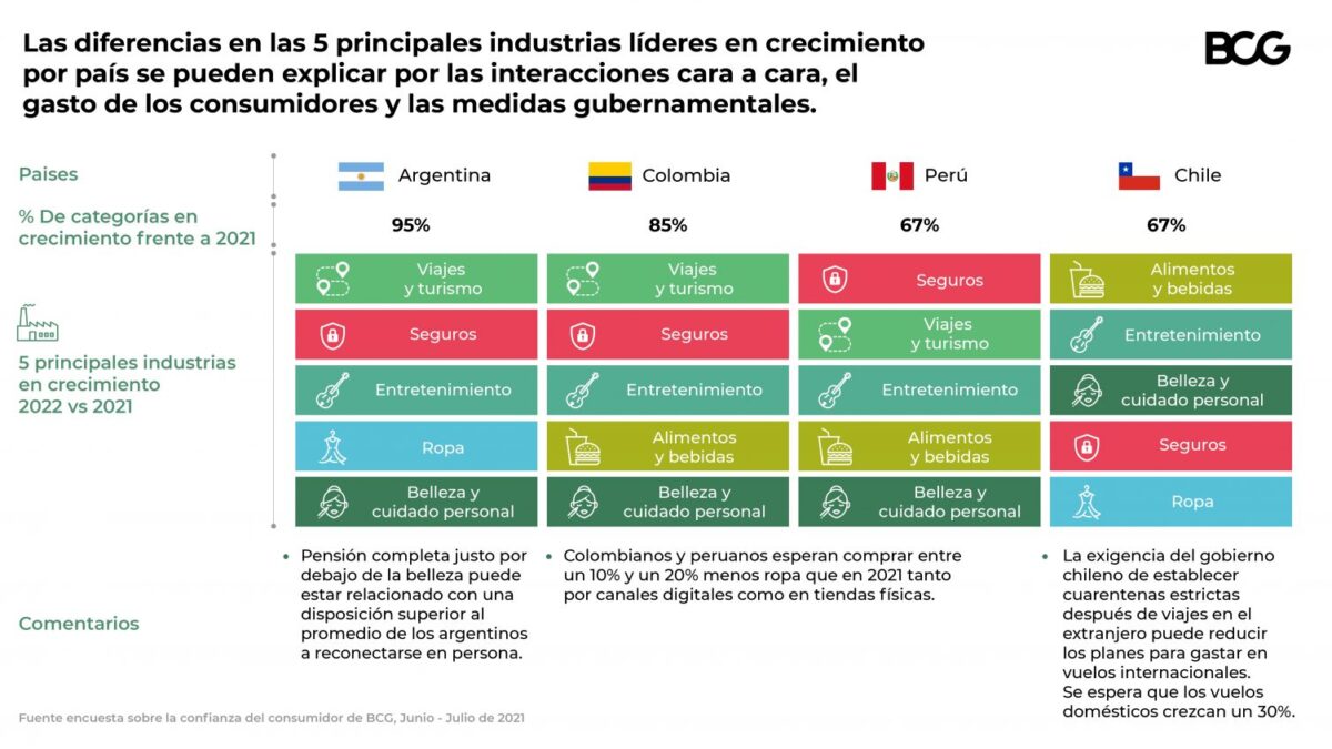 “Los tiquetes para vuelos internacionales y los alimentos orgánicos fueron las dos categorías con las perspectivas de gasto más positivas para 2022 en América del Sur”, confirmó la ejecutiva de Boston Consulting Group. “Los consumidores también esperan gastar más en ropa y equipo para hacer ejercicio, en Wi-Fi para el hogar y en nuevas tecnologías para el hogar. Dicen que usarán más aplicaciones para compartir viajes y gastarán más en bebidas alcohólicas y comidas en restaurantes”.