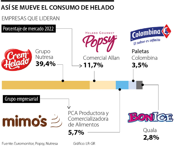 De acuerdo con un sondeo que hizo La República y Euromonitor estos son las marcas de helados que lideran en Colombia. La mayor concentración de mercado la tiene Crem Helado, marca de Grupo Nutresa, con un porcentaje de 39,4%, le sigue Popsy, de Comercial Allan, con 11,7%, el tercer puesto lo ocupa Mimo’s, con un total de 5,7%, el cuarto y quinto puesto lo tienen Paletas Colombina con un 3,5% y Bon Ice con 2,8%.