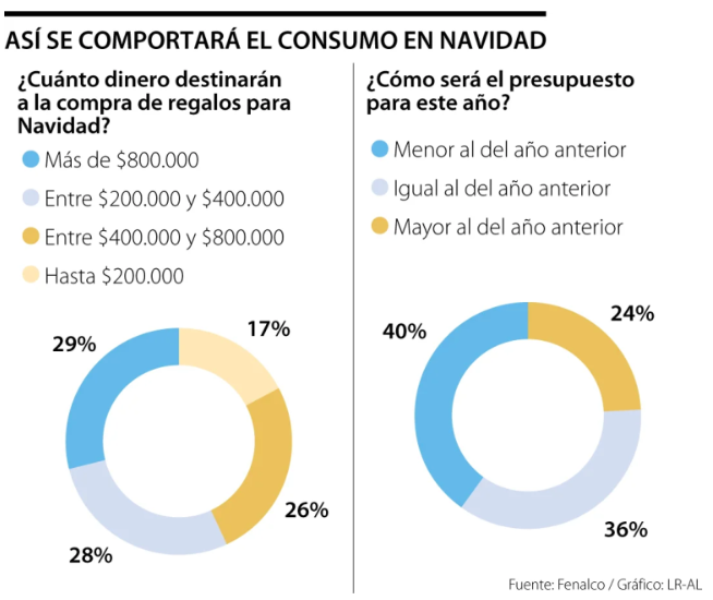 En una nueva Bitácora Express de Fenalco, esta vez sobre las actividades y gastos de temporada, se informó que los colombianos bajarán 40% su presupuesto de este año para las compras navideñas. Mientras en diciembre de 2021 las personas habían destinado $500.000, en este 2022 la cifra promedio es de $400.000.