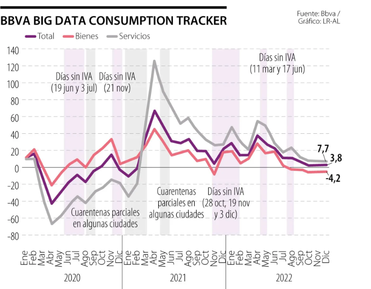 Según una publicación de BBVA Big Data Consumption Tracker, el gasto en bienes se redujo 4,2% y el gasto en servicios se expandió 7,7% en diciembre del año pasado. Específicamente, en el último mes de 2022 el consumo repuntó y alcanzó una variación real anual de 3,8% frente a 2,3% que se reportó en noviembre.