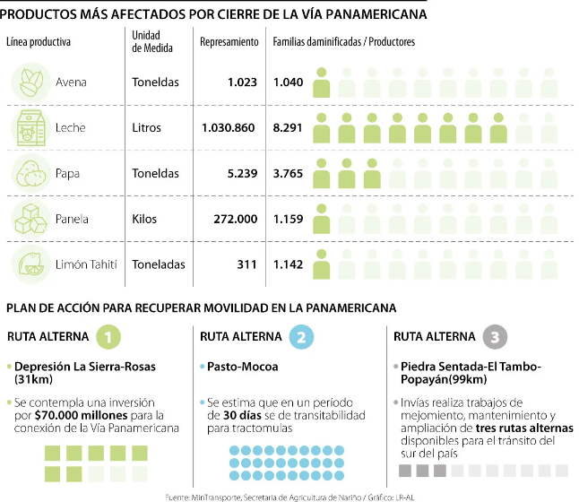 Mientras que Soraya Arias, gerente de Colácteos Nariño, empresa procesadora y recolectora de leche del departamento, explicó que son varias las consecuencias que han vivido por el cierre de la vía, y alegó que esto no es solo una emergencia ambiental sino también económica y social.