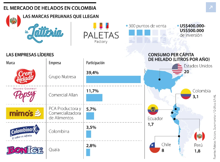 El mercado al que buscan entrar está dominado por la heladería industrial. Según datos de Euromonitor, Crem Helado, marca de Grupo Nutresa, tiene la mayor concentración de mercado, con una participación de 39,4%.