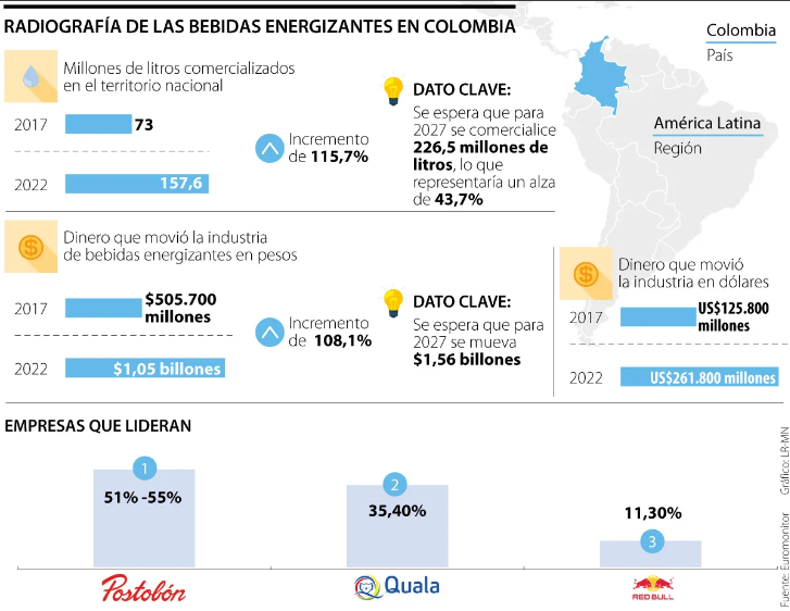 Según Euromonitor, la industria de energizantes en Colombia movió alrededor de 157,6 millones de litros de la bebida en 2022. Esto equivale a un incremento de 115,7%, debido a que en 2017, el movimiento de este producto fue de 73 millones de litros. Además, se espera que para 2027 se comercialicen 226,5 millones de litros, lo que representaría un alza de 43,7%.