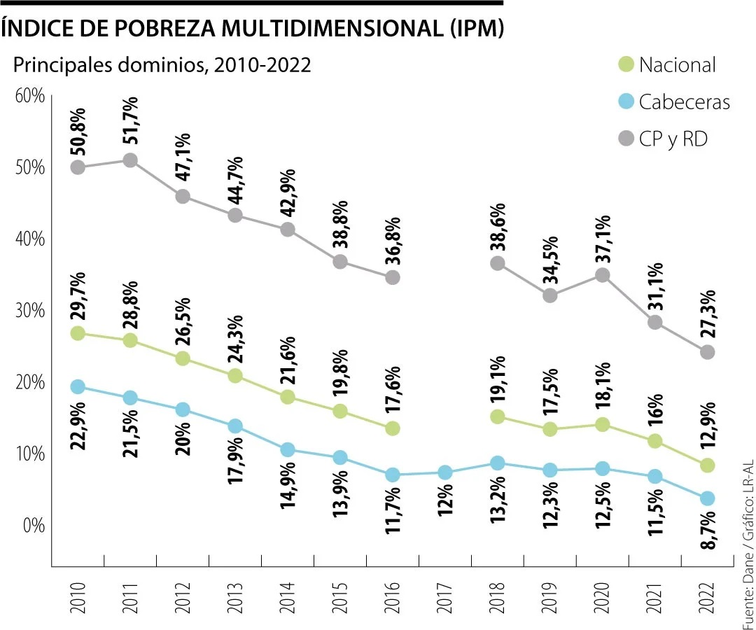 El Departamento Administrativo Nacional de Estadística (Dane) reveló el dato del Índice de Pobreza Multidimensional (IPM) para 2022, el cual se ubicó en 12,9%. Esto significó que 1,4 millones de personas salieron de esa condición en el bienio anterior, mientras que 6,6 millones están viviendo con la incidencia de estas bajas condiciones de calidad de vida.