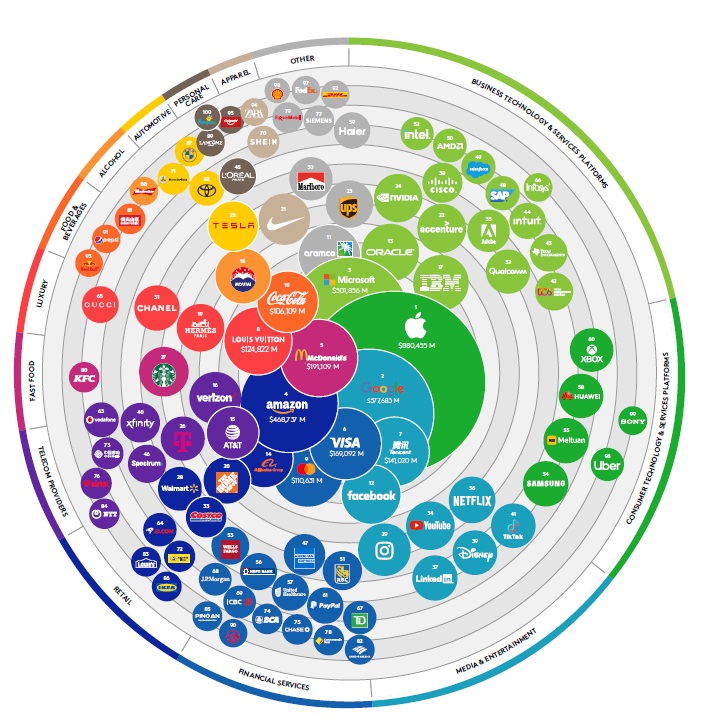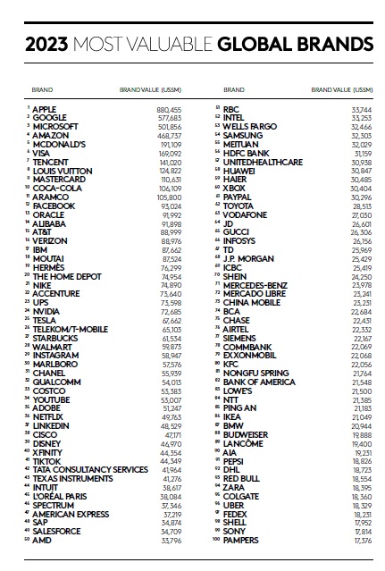Apple sigue siendo la marca mundial más valiosa, con un valor de marca de US$880.000 millones, seguida de Google (US$578.000 millones) y Microsoft (US$502.000 millones).