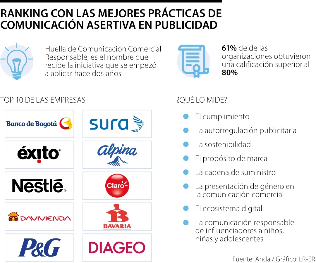 Las 10 empresas con mejor puntuación de la Huella de la Comunicación Comercial Responsable en 2022 fueron Banco de Bogotá, Grupo Éxito, Nestlé, Davivienda, P&G, Sura, Alpina, Claro, Bavaria y Diageo.