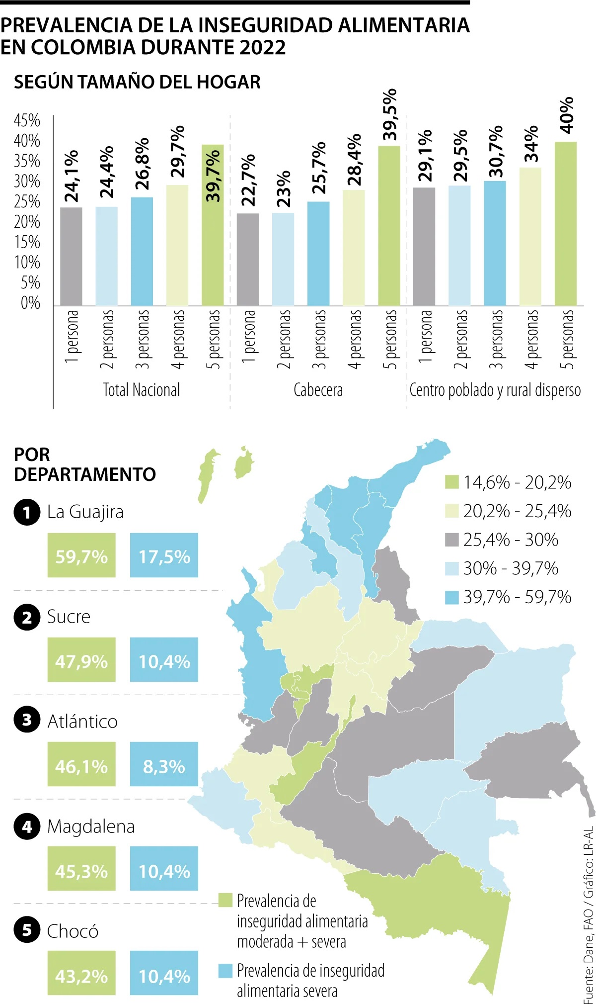 La Guajira es el departamento donde hay mayor prevalencia de inseguridad alimentaria moderada o severa, con 59,7%. En este ranking le siguen Sucre (47,9%), Atlántico (46,1%), Magdalena (45,3%), Chocó (43,2%) y Cesar (41,1%). En estos departamentos más de 40 de cada 100 hogares tuvieron dificultades para acceder a alimentos en cantidad o calidad suficiente durante 2022.