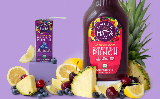 La marca estadounidense de jugos de frutas orgánicos Uncle Matt’s Organic está agregando una nueva bebida funcional a base de frutas, Superfruit Punch, a su cartera. El producto, presentado como una bebida “mejor para usted y potenciada con antioxidantes”, presenta una mezcla de “superfrutas” que incluyen cerezas dulces oscuras, arándanos y saúco negro.