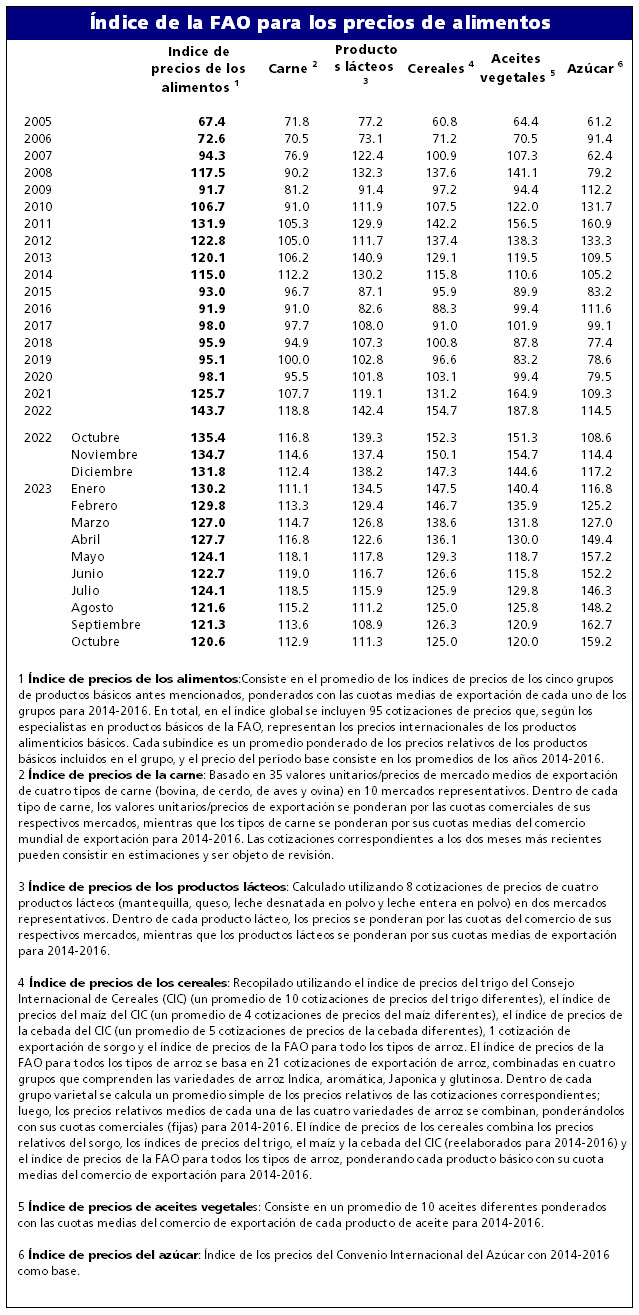 El índice de precios de los alimentos que elabora la FAO registró un promedio de 120,6 puntos en octubre, es decir, un 0,5% menos que en septiembre, continuando así la tendencia a la baja y situándose un 10,9% por debajo de su valor de hace un año.