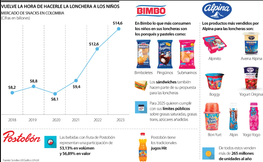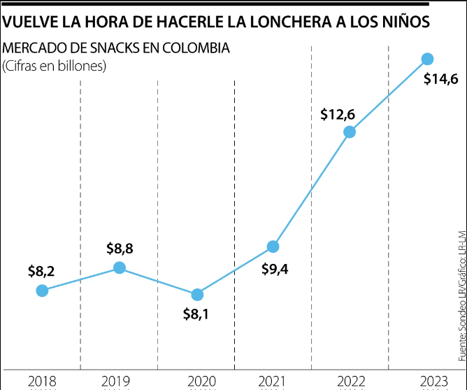 A partir del 15 de enero de 2024, por lo menos el 80% de los estudiantes regresan a clases, lo que genera que los padres no solo se preocupen por los útiles escolares, sino también por la lonchera, lo que reactivara al negocio de snacks que movió $14,6 billones en 2023 y que ha tenido un aumento de 77% desde 2018.