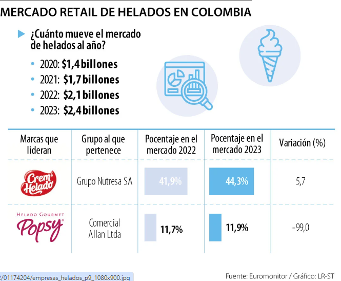 Las marcas que lideran este mercado son Crem Helado, con una participación en el mercado de 44,3% en 2023, seguida de Popsy, del grupo Comercial Allan Ltda (11,9%); Colombina, de Colombina SA (6,9%); Mimo´s, de PCA Productora y Comercializadora de Alimentos SA (5,8%); y BonIce, de Quala SA (2,7%).