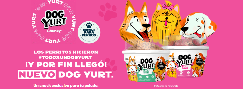 Alpina a través de su sitio web oficial, lanzó en alianza con Chunky nuevo “DogYurt”, un snack para perros a base de agua, alto en proteínas, con probioticos y sin lactosa. El producto se encuentra disponible en una presentación por 160gr en dos sabores diferentes: Salmon-arandanos y pollo-trigo.