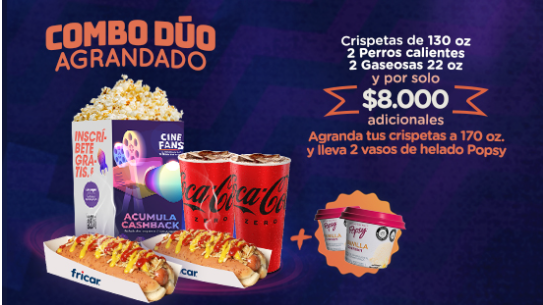 Cinemas Procional, a través de su página web, lanzó una campaña promocional en alianza con Popsy, Coca-Cola y Fricar para los combos Dúo y Super, en donde por $8.000 adicionales se entregan 2 vasos de helado y agrandan las crispetas, siempre que el consumidor beba exclusivamente productos Coca-Cola. La actividad es válida, desde el 15 de febrero hasta el 30 de abril de 2024 y/o hasta agotar existencias.