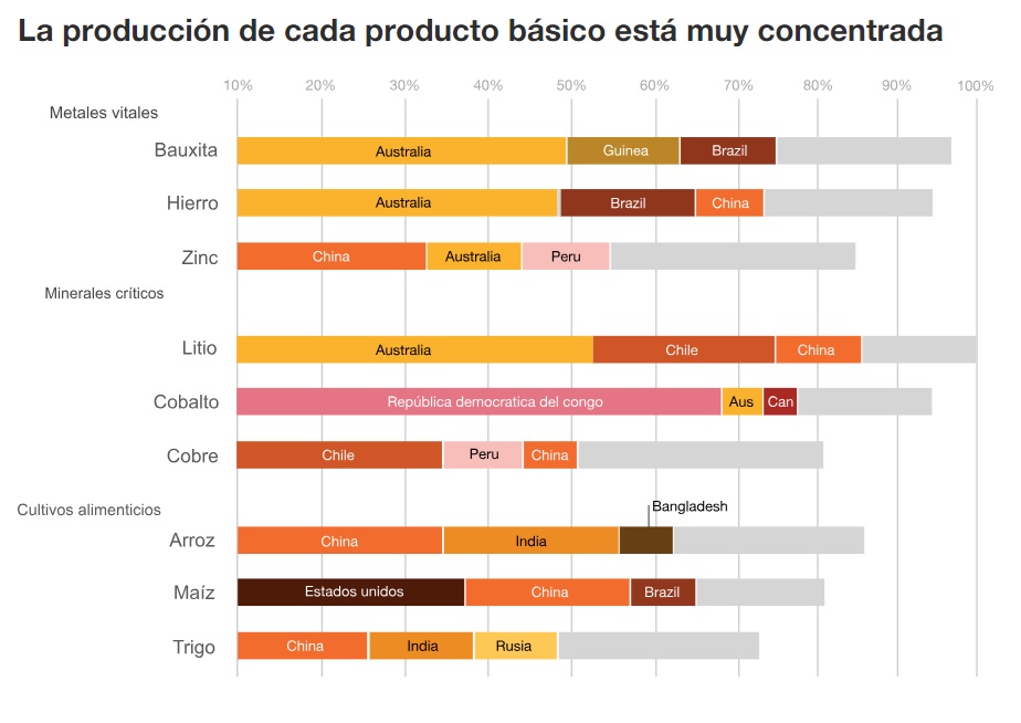 Asimismo, la producción de las 9 materias primas estudiadas está altamente concentrada en un número limitado de países, lo que aumenta los riesgos para el abastecimiento global. Por ejemplo, en la República Democrática del Congo, cuatro minas que producen el 47% del cobalto mundial están situadas a lo largo de un único tramo de carretera de 100 kilómetros.