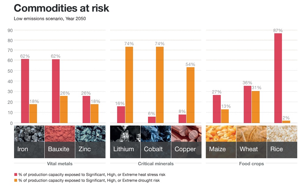 Por otro lado, el estudio destaca los riesgos específicos que enfrentan diversas materias primas clave. En cuanto a los metales vitales, el 62% de la producción de hierro y bauxita estará en riesgo debido al estrés por calor en 2050, al igual que el 26% de la producción de zinc. Los minerales esenciales también se verán afectados, con el 74% de la producción de litio y cobalto y el 54% de la producción de cobre en peligro por la sequía en 2050. Los cultivos alimentarios no están exentos de estos riesgos: el 87% de la producción de arroz, el 36% del trigo y el 27% del maíz estarán en riesgo debido al estrés por calor en el mismo año.